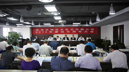6月26日,北京京城机电股份有限公司(以下简称“公司”)2013年度股东周年大会在京城机电大厦18层第一会议室隆重召开。会议审议通过公司2013年年度报告、董事会和监事会2013年年度工作报告、选举第八届董事会成员和第八届监事会成员等19个议案。会议由公司副董事长王平生先生主持,公司部分股东、股东代表、董事、监事、高级管理人员和各中介机构负责人及相关人员出席了会议。